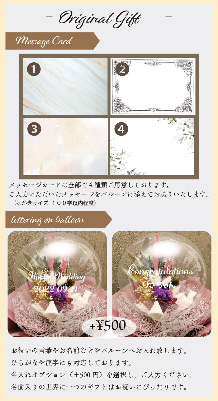 | 贈り先 | 友人 家族 恋人 夫 妻 親戚 父 母 祖父 祖母 曾祖父 曾祖母 孫 赤ちゃん お父さん お母さん おじいちゃん おばあちゃん ひいおじいちゃん ひいおばあちゃん 上司 部下 恩師 先生 生徒 アイドル 推しメン ファン 男の子 女の子 |